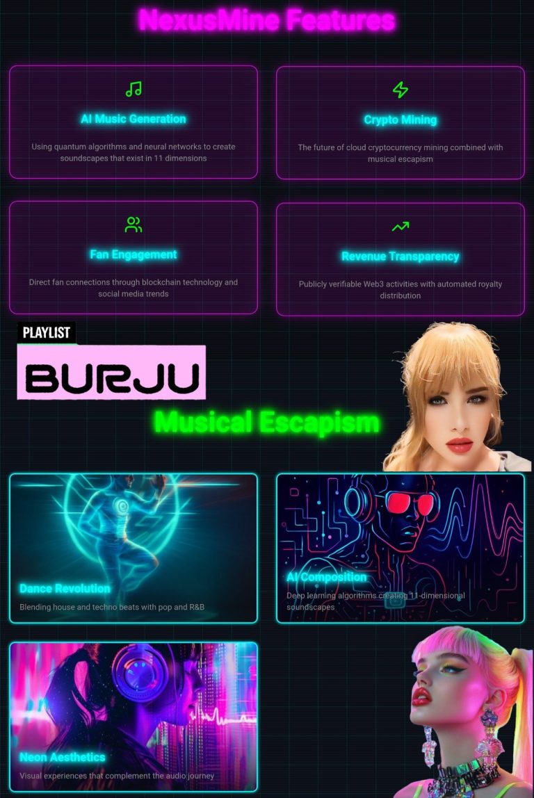 The future of cloud cryptocurrency mining combined with musical escapism and AI optimization.